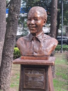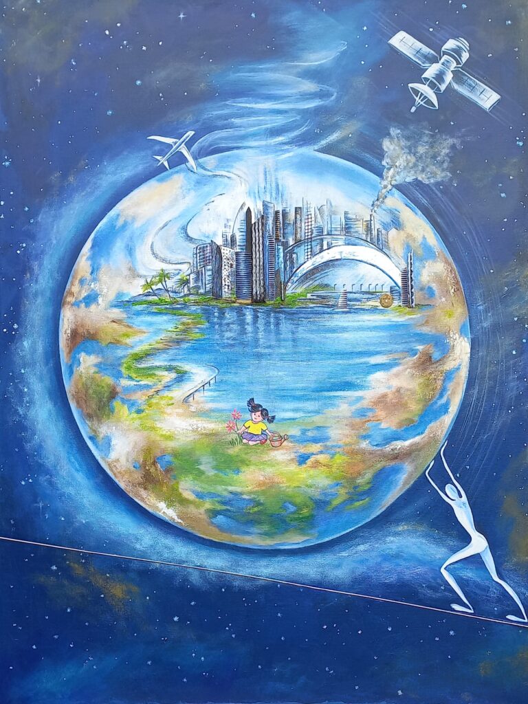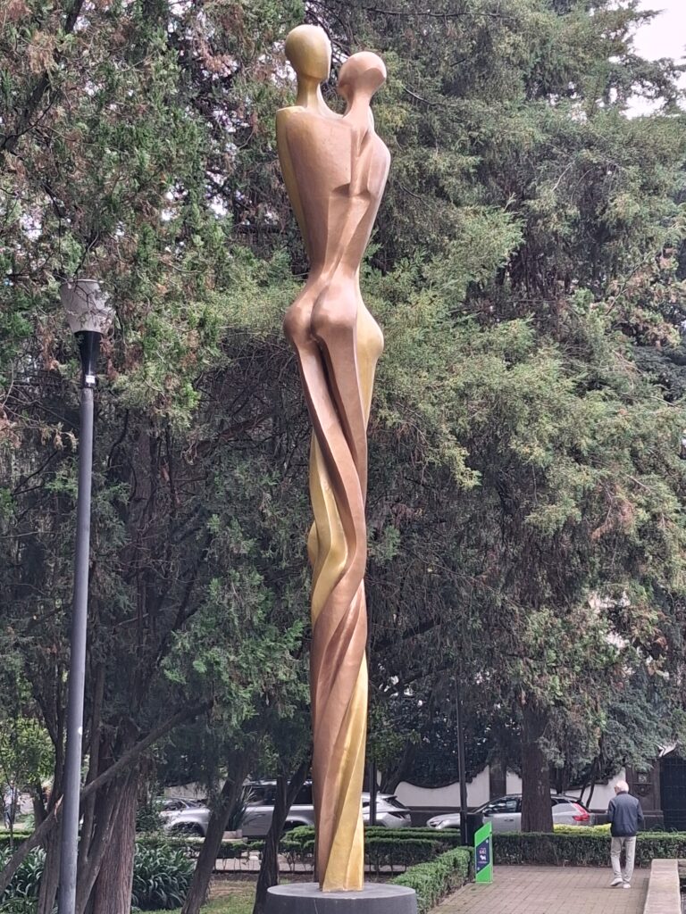 Dans ce même parc, je rencontre des sculptures en pierre notamment la représentation de la terre et tout à coté un couple d’Etres longilignes . Je constate à nouveau une correspondance avec un autre de mes tableaux réalisé deux ans avant ce voyage. Le thème que j avais choisi sur l’Evolution de notre planète, montre des représentations similaires avec la terre et cette même silhouette d’Etre longiligne. La petite fille brune qui arrose des fleurs pourrait bien d’ailleurs être Mexicaine!