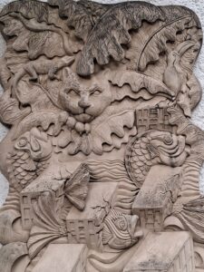Au détour d’une visite dans le Parc « ESPACIO CULTURAL NELSON MANDELA » Polanco , découverte étourdissante d’un bas relief en pierre composé d’un assemblage au thème animalier et végétal en total correspondance avec ma création intuitive réalisée plus d’un an avant même ce voyage ! On peut retrouver le fauve, le toucan, le lézard, le serpent, les palmiers et l’aquatique.. Troublant!